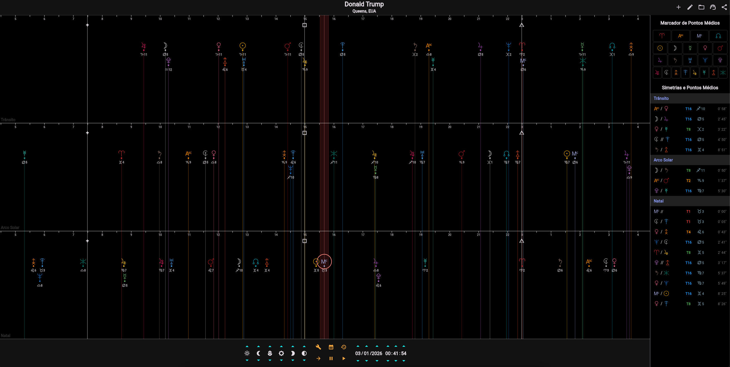 A análise da Astrologia Uraniana para Donald Trump em 2026 revela um líder operando em duas realidades paralelas. Enquanto o mundo observa os movimentos estratégicos de expansão e os sucessos comerciais estrondosos, as engrenagens astrológicas mostram um homem lidando com o peso de decisões complexas, muitas vezes forçadas por circunstâncias sombrias e segredos de Estado que exigem uma “limpeza” forçada.